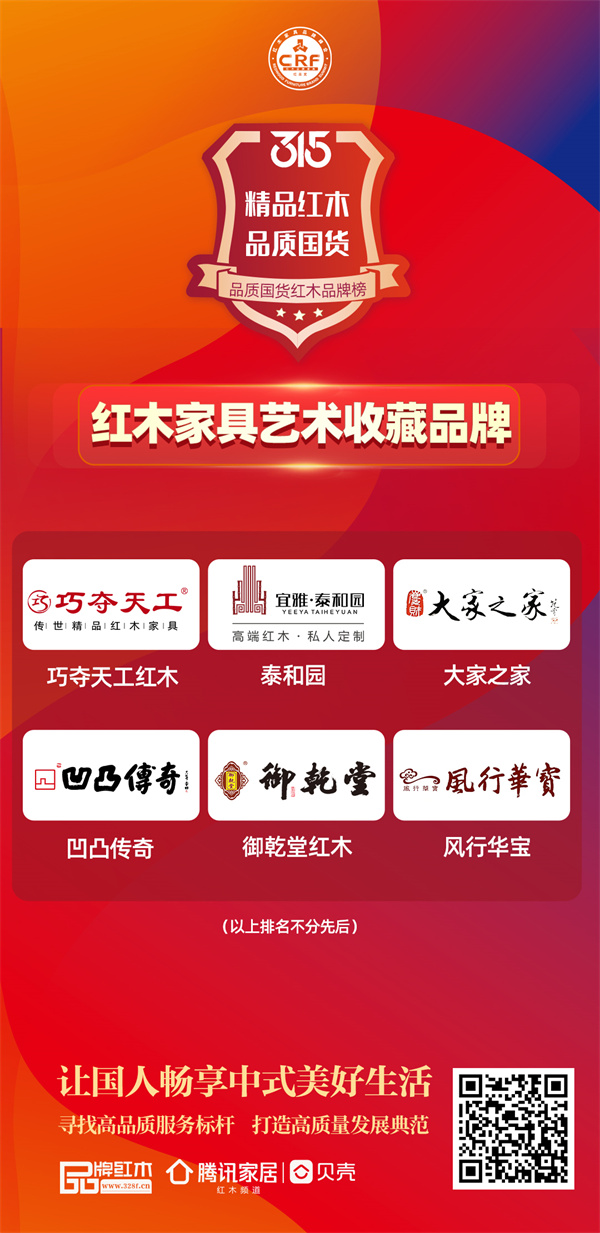 品牌红木&腾讯家居|贝壳联合特别策划《315品质国货红木品牌榜》,覆盖5+品类,超过30+优选品牌,旨在寻找高品质服务标杆,打造高质量发展典范。打造精品红木,做高品质国货,让国人畅享中式美好生活!以下为315品质国货红木品牌榜——红木家具艺术收藏品牌。