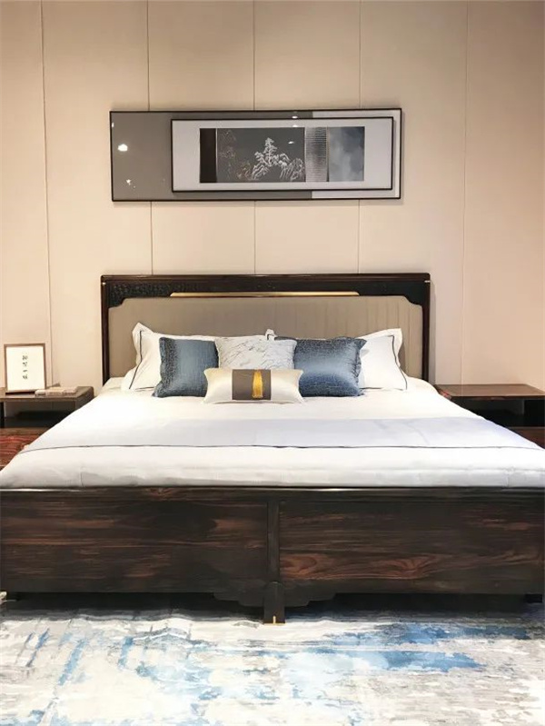 卧室是身心休憩的私密空间,更需要宁静舒缓的氛围。家宝黑酸枝新中式卧室系列一改传统红木卧室家具的厚重感,强调明式家具的明快简约,融合现代舒适元素。