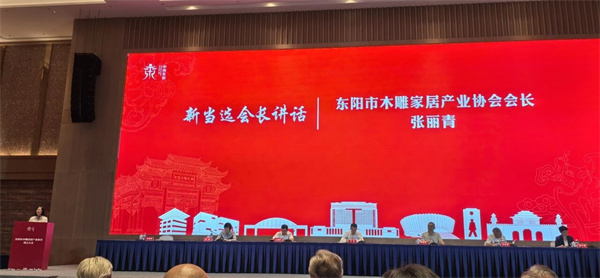 成立大会上,东阳市委副书记、市长任魁出席并致辞,新当选会长张丽青发表讲话。在全体与会人员的共同见证下,东阳市木雕家居产业协会正式揭牌成立。各方代表齐聚一堂,围绕行业趋势、工艺创新与融合发展展开交流,共谋木雕家居产业未来新蓝图。