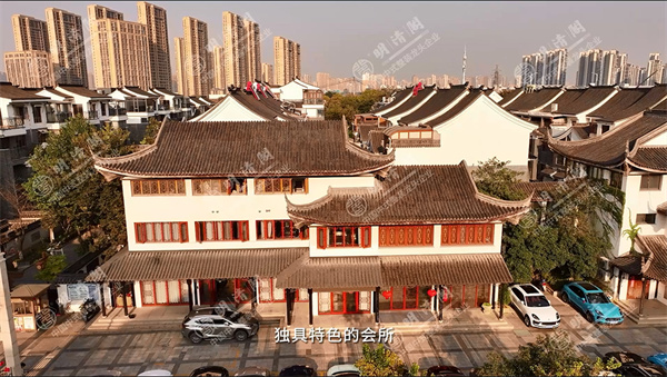 会所外观保留了江南古镇的传统建筑风格,白墙灰瓦、飞檐翘角,每一处细节都流淌着浓郁的水乡气息。
