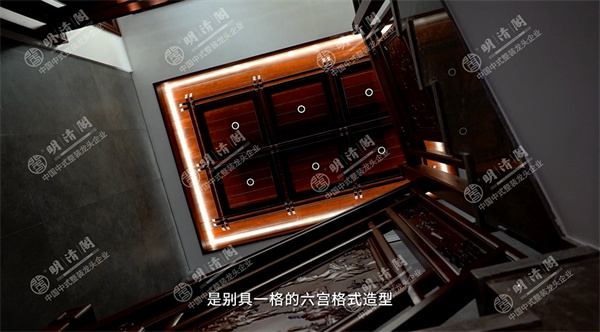 沿扶梯而上,二楼的六宫格吊顶别具一格。每格均设有圆形筒灯,寓意“方中有圆”,寄托了处事圆满、家庭和睦的美好愿望。茶室区域的九宫格井口天花则蕴含招财纳福之意,与主背景墙相互呼应,既传统又实用。