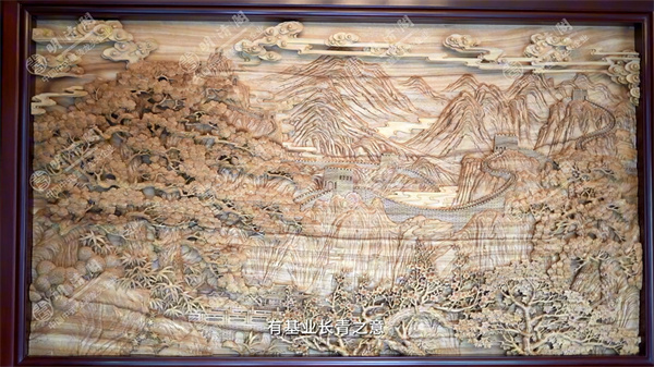 推门而入,中式风格带来的人文气息扑面而来。传统厅堂中的金柱与青石柱础被巧妙地融入现代建筑之中,匠人以木为纸,以刀代笔,勾勒出一幅令人惊叹的万里长城画卷。这幅长城图辅以梅、兰、竹岁寒三友相伴,既寓意基业长青,又为空间平添了几分文人雅士的高洁情怀。