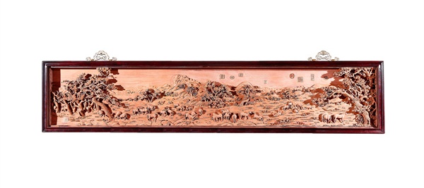 作品以东阳木雕的传统技术手法,将草木、山水、马匹们或卧或立、或嬉戏、或觅食,自由舒闲,聚散不一等各种形象姿态雕刻的细致入微,生动立体,栩栩如生。