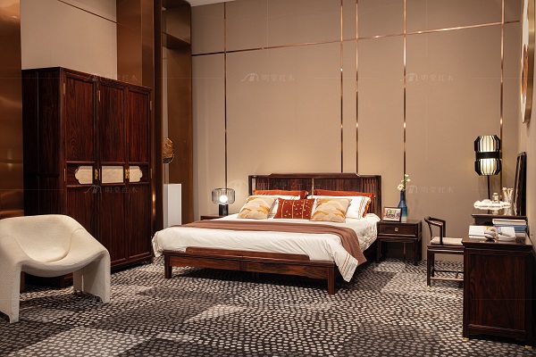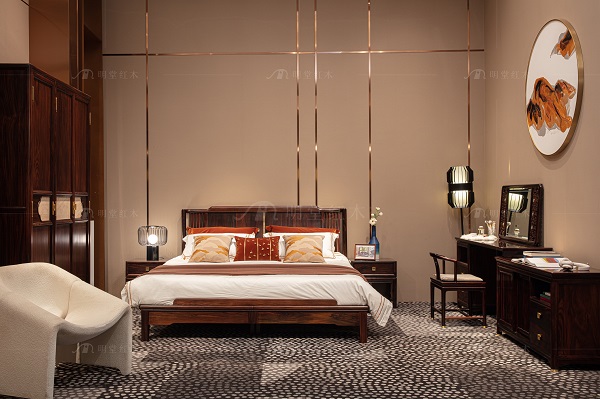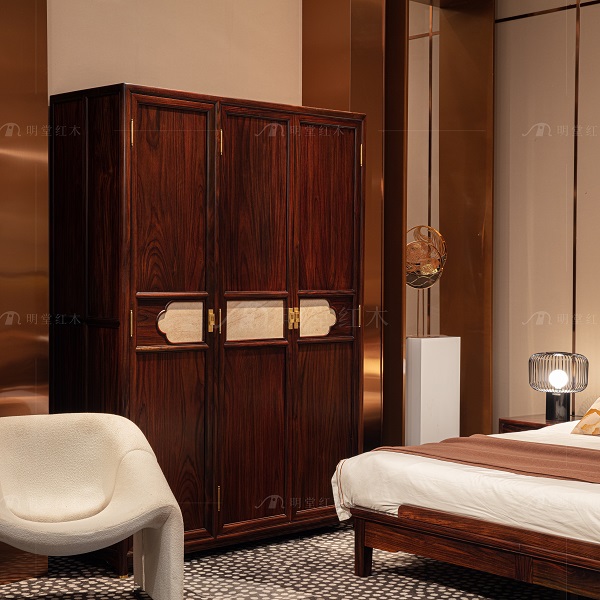 步入这方卧室空间,目光不由自主地被那片由阔叶黄檀打造的三门衣柜所吸引。这种被誉为“东方玫瑰木”的珍贵木材,以其深沉的色泽和优雅的木纹,成为空间气质的奠定者。每一道纹理都是自然的笔触,记录着岁月的故事;每一寸触感都温润如玉,传递着手工打磨的匠心温度。明堂家居对材料的精挑细选,使得家具不再是冰冷的物件,而是有了生命温度的陪伴。