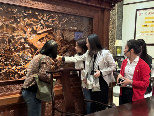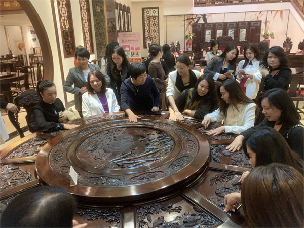在工艺互动区,女企业家们通过亲手拆装,感受了榫卯结构的精妙;在参观了国方家居获奖雕刻工艺作品后,感受到了传统手工雕刻的专注和精巧,大家在一室的在木韵芬芳中,对“匠心”二字有了更切身的体会。