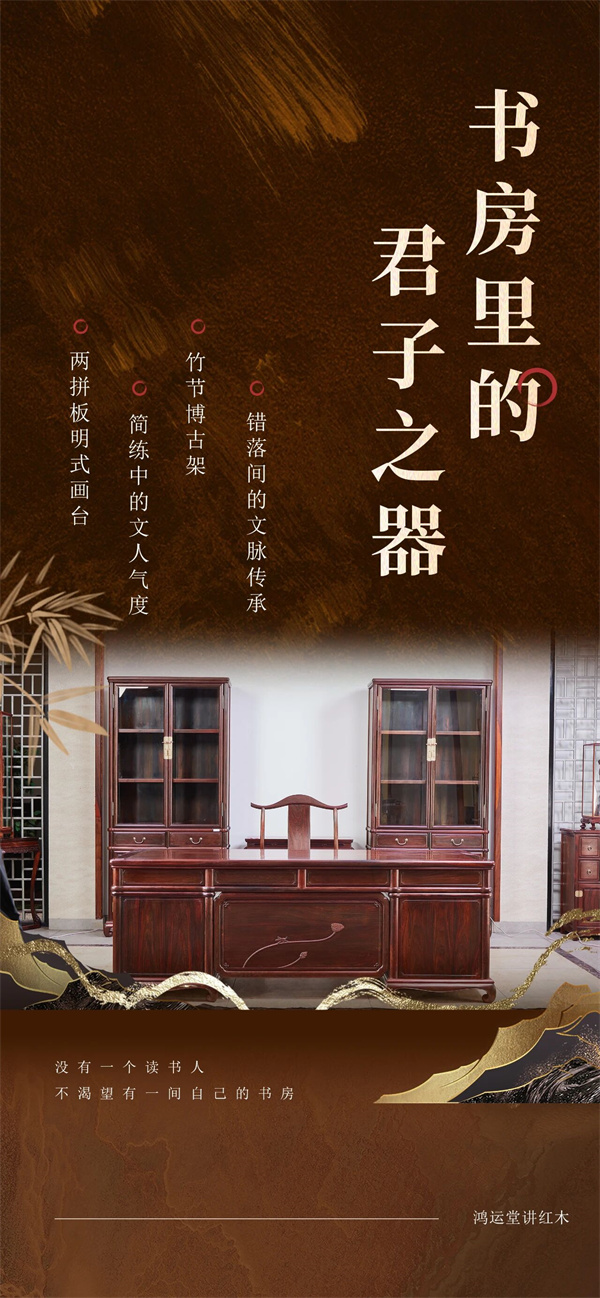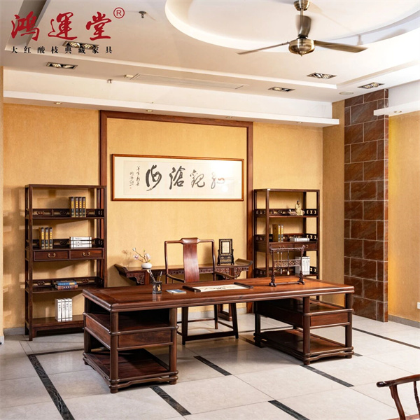 在现代生活节奏日益加快的今天,一间红木书房更像是一个精神避风港。鸿运堂大红酸枝书房家具,以其温润的质感、典雅的造型、深厚的文化内涵,为当代读书人营造了一方宁静致远的心灵空间。