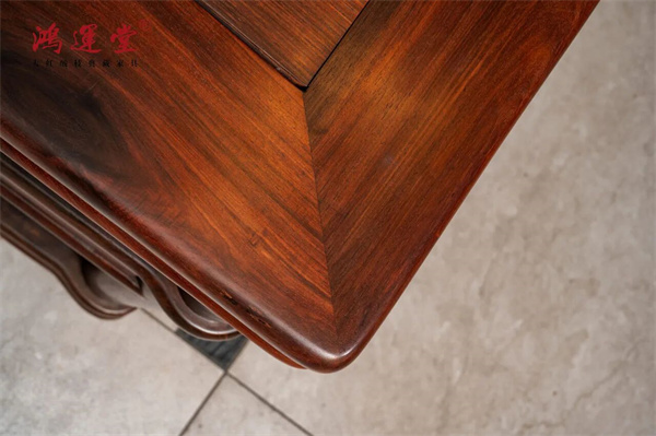 《两拼板明式画台》通体选用老挝大红酸枝(学名:交趾黄檀),木质坚硬致密,纹理如行云流水,色泽沉稳温润。