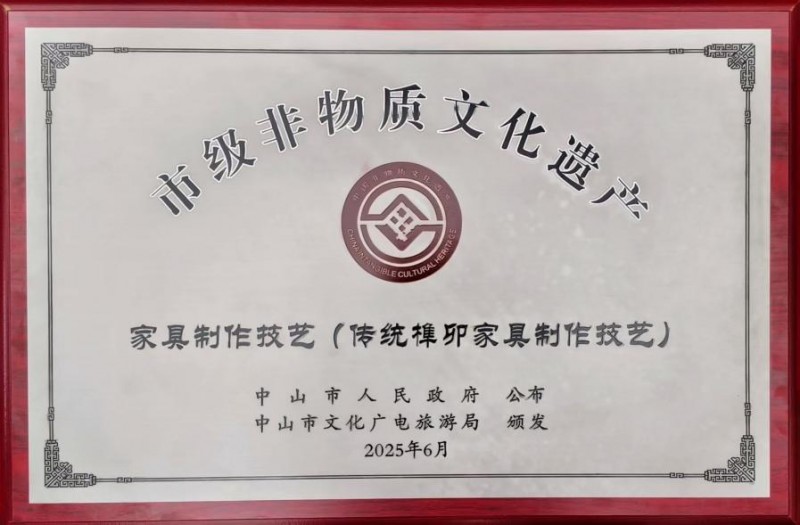2025年中山市“文化和自然遗产日”非遗文化周启动,活动主会场现场公布并颁发了第十二批市级非物质文化遗产项目牌匾。由区氏家具作为传承单位的“家具制作技艺(传统榫卯家具制作技艺)”被列入中山市级非遗名录。