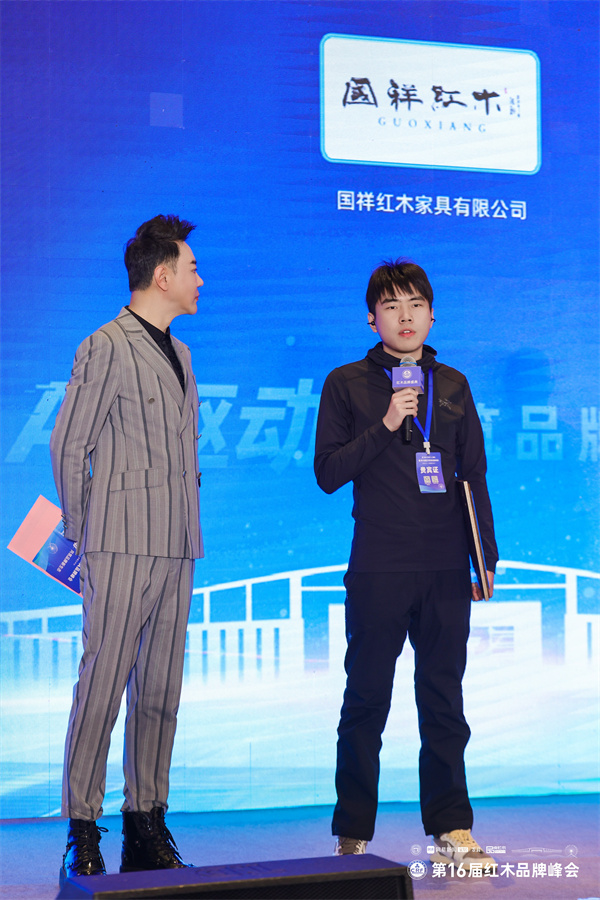 总经理张宇杰上台领取“2025红木家具十大影响力品牌”奖项,并在台上接受央视知名主持人肖贵宁的采访。