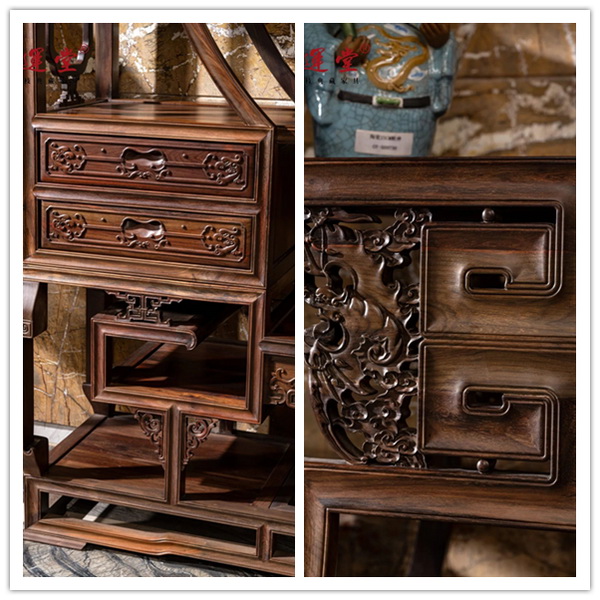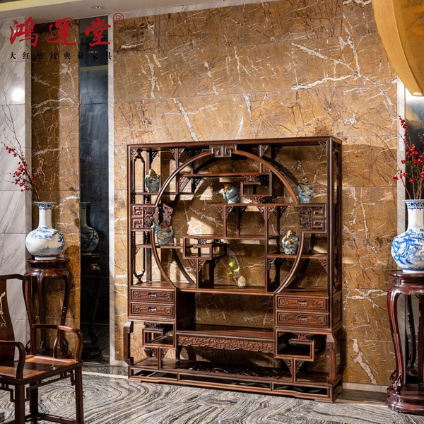 既可陈列古玩玉器、茶具雅器,又能分隔空间、美化家居,大红酸枝的温润纹理与精致工艺相得益彰,摆放在客厅、茶室,尽显中式雅致格调。
