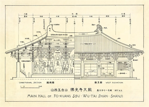 梁思成、莫宗江等手绘中国古代建筑图《山西五台山佛光寺大殿》