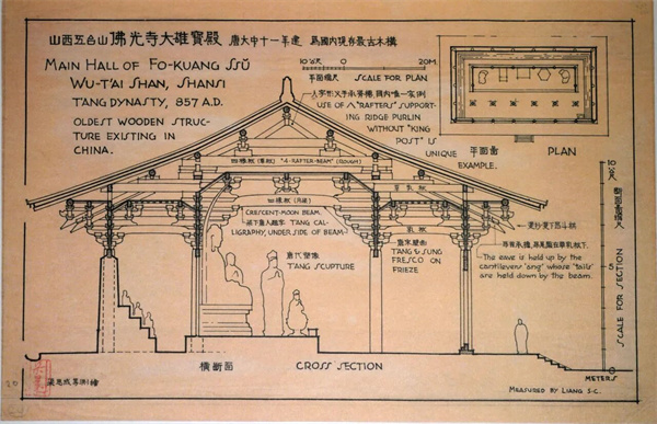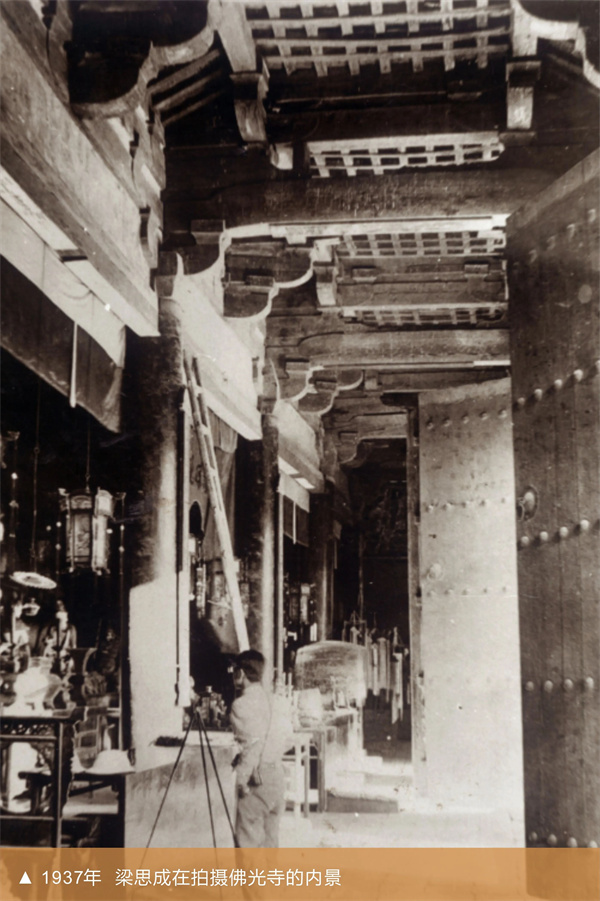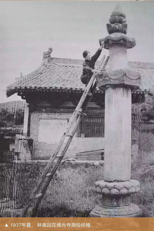 1937年6月,梁思成、林徽因夫妇一行几经艰辛,找到了兴建于唐代(857年)的佛光寺,破除了日本学者“中国已经不可能找到唐代的木构遗存”的结论,并绘出建筑图纸