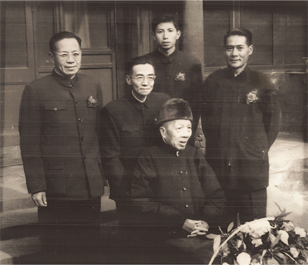 1961年12月7日,朱桂老九十大寿时合影;后排左起:王世襄、梁思成、张允冲、朱文榘