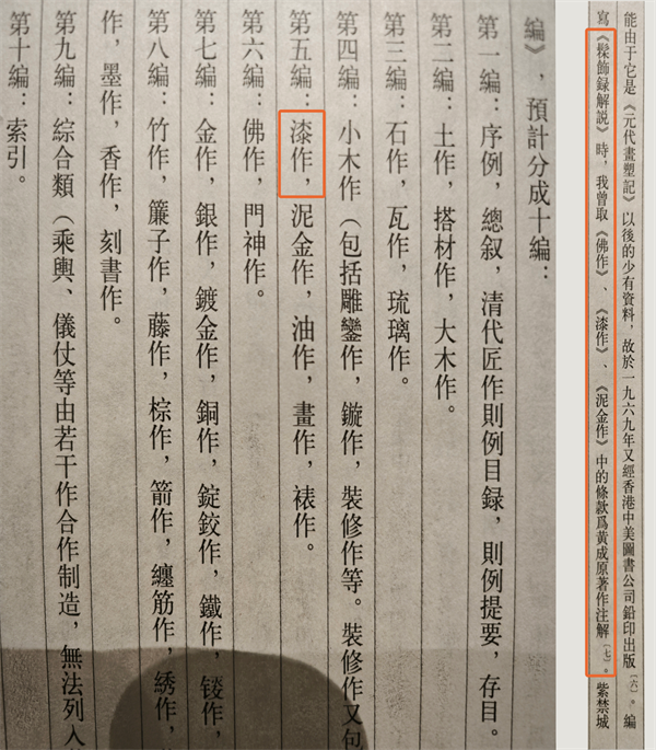 然而,解说并非易事。原著者黄成从原料、工具、设备、禁忌、品种、制造、修复等方面,记录了前人与自己的髹漆经验。后有嘉兴名漆工杨明作注,内容更加翔实。但《髹饰录》仍有明显不足,王世襄在《解说》前言中辩证分析了此书的价值与局限。