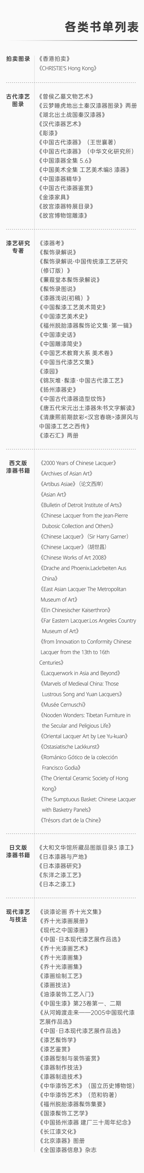 梳理可知,王世襄的漆艺藏书主要来自文物考古、轻工业与艺术类、高校类权威出版社,还有海内外博物馆与拍卖行、漆器主要产地研究单位、考古研究机构。考古现场、展览现场、生产现场,再加上学院研究,这四个维度构成了他与我国漆艺研究的宏大框架。