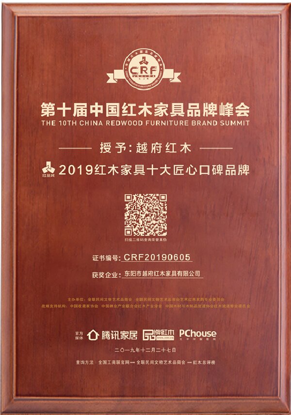 同时,越府以“诚信、务实、创新、超越”为经营理念,凭借稳定的品质与贴心服务,在业界与消费者中积累了良好口碑,曾斩获“红木家具十大匠心口碑品牌”等荣誉。