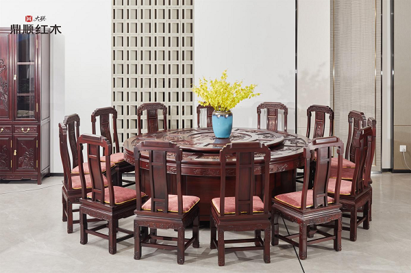 餐厅里,一张好餐桌,装得下家人三餐,也藏着四季相聚的温情。鼎顺这款红酸枝圆桌,就是烟火日常里一份朴实的陪伴。