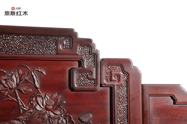 卧房需要的是静谧、温润与安心。鼎顺这款国宾款红木床,形制沉稳,细节柔和,为睡眠营造出安稳的氛围。床体用料扎实,结构牢靠,没有繁杂的装饰,只在床头屏位置刻有简约的荷花纹样,格调清雅,也让整体多了一层柔和的层次。