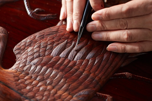 工艺独到,细节见真章:怀古是仙游首家运用“丝翎檀雕”雕刻工艺的品牌。这种技法能将禽鸟的羽毛刻画得纤毫毕现,极其考验工匠水平。