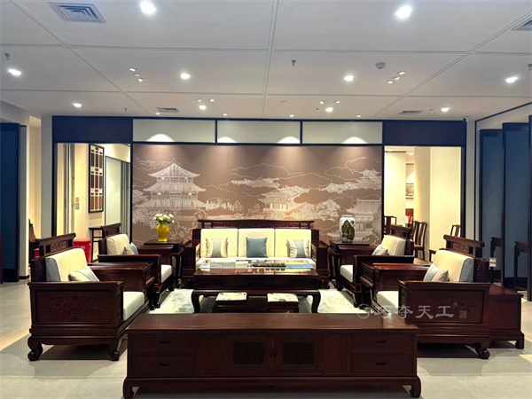 走进巧夺天工红木成都直营店的展厅,1000平方米的空间被精心划分为客厅、餐厅、卧室、书房、办公室等不同场景。从传统的中式古典到现代简约的新中式风格,从几万元的实用家具到上百万元的收藏级精品,这里几乎涵盖了红木家具的所有品类。