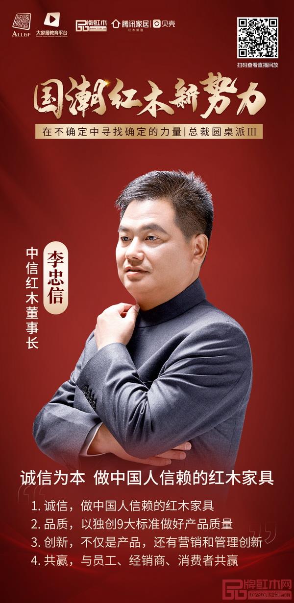 在《国潮红木新势力》直播中,全联艺术红木家具专业委员会主席团主席、中信红木董事长李忠信,以《诚信为本做中国人信赖的红木家具》为主题做了精彩分享,以下是李忠信董事长的分享精华整理。