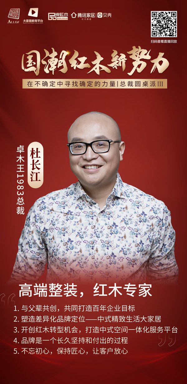 在直播中,卓木王总裁杜长江以《高端整装 红木专家》为主题进行了精彩分享,他以卓木王的发展之路为例,讲述品牌是一件长久坚持和付出的过程,并提出了红木行业转型发展的新机遇。以下是杜长江总裁的分享精华整理: