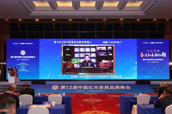 峰会同期举办了2022年CRF“红品奖”红木品牌盛典。在红木品牌盛典现场,东阳市苏阳红红木家具有限公司(以下简称苏阳红红木)一举斩获三项大奖,荣获“2022红木家具十大影响力品牌”、“2022红木全屋定制热门品牌”,同时,营销总监赵增晖荣膺“2022红木家具杰出职业经理人”荣誉称号。