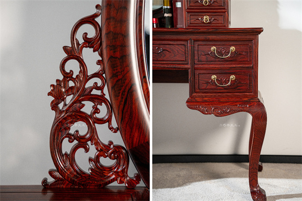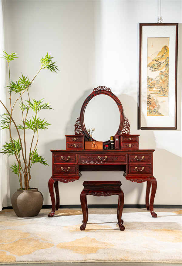 这款巧夺天工红木101梳妆台的设计,深谙东方女性的典雅之美。椭圆镜框线条流畅顺滑,映照出最动人的容颜。镜子两侧精雕细琢的卷草纹生机盎然,寓意青春永驻、美丽长存。