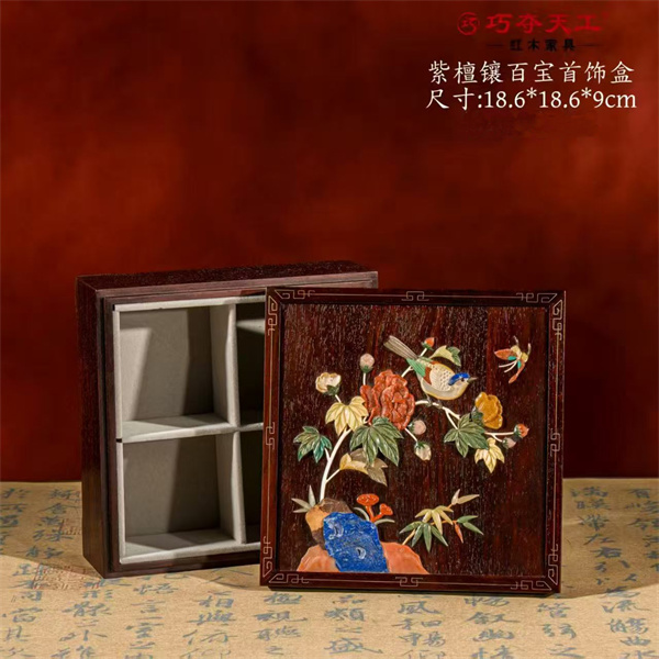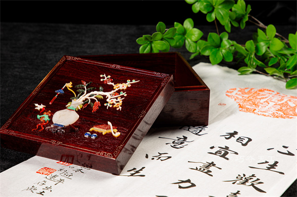 百宝嵌首饰盒:盒面施以精湛的百宝嵌工艺,以各色玉石、玛瑙、珊瑚、白贝镶嵌出枝叶果实与点点梅花,画面生动自然。光影流转间,盒面闪烁着宝石的温润光芒,为收纳增添无限趣味。